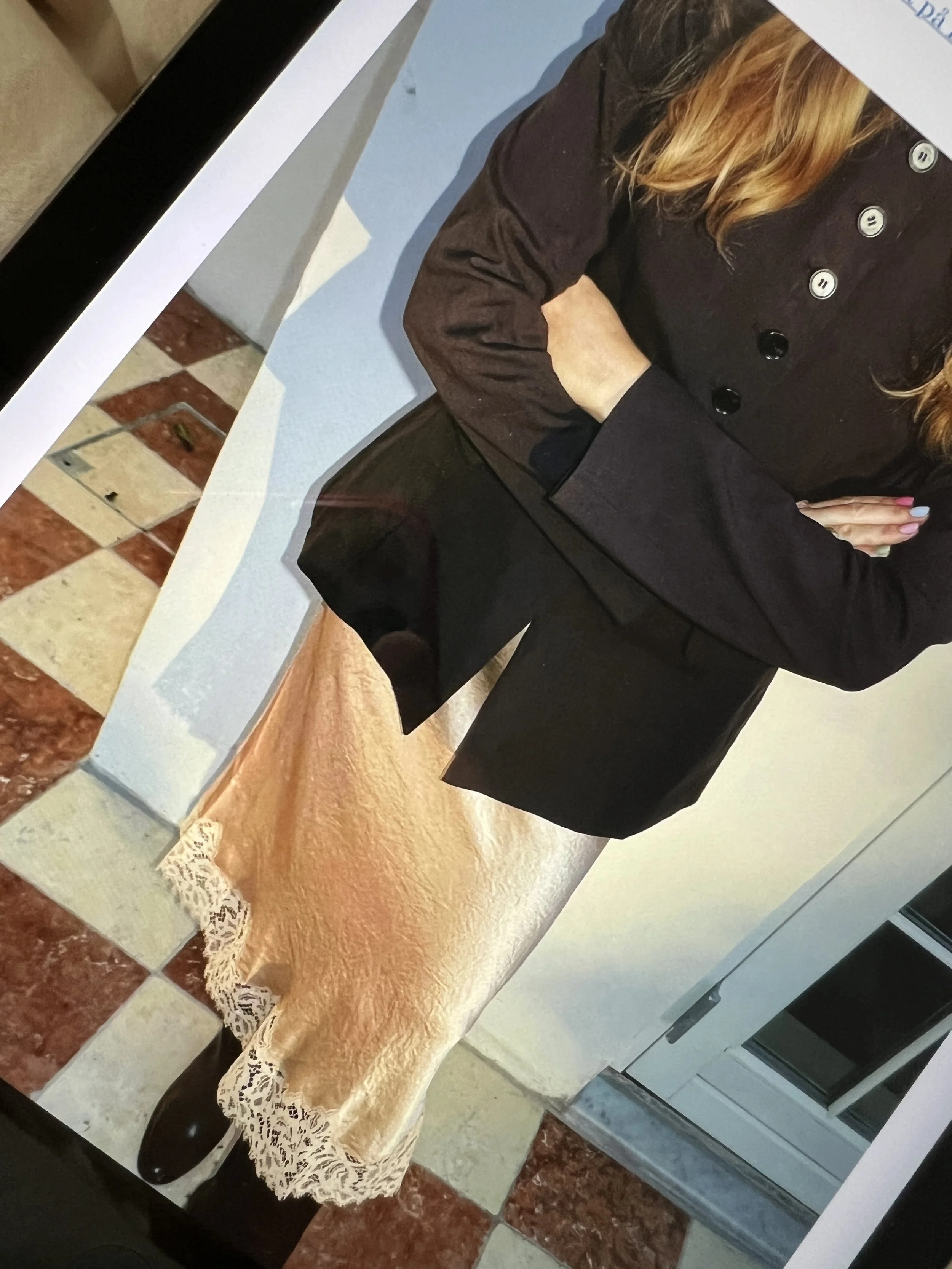 Fun mix for a party. Slip, jacket and boots. I also got four silk nightgowns / slips from my aunt, so I'm going to copy this one straight away. I need to buy a nice, thin bra though. The fun thing about getting clothes and shoes from my aunt Lore in Santa Barbara is that we have the same size for both clothes and shoes, but we look so different in height and shape. I’m going to do a little post about it next week. So you can see a little more of what I got. Really, really nice things. So fun!