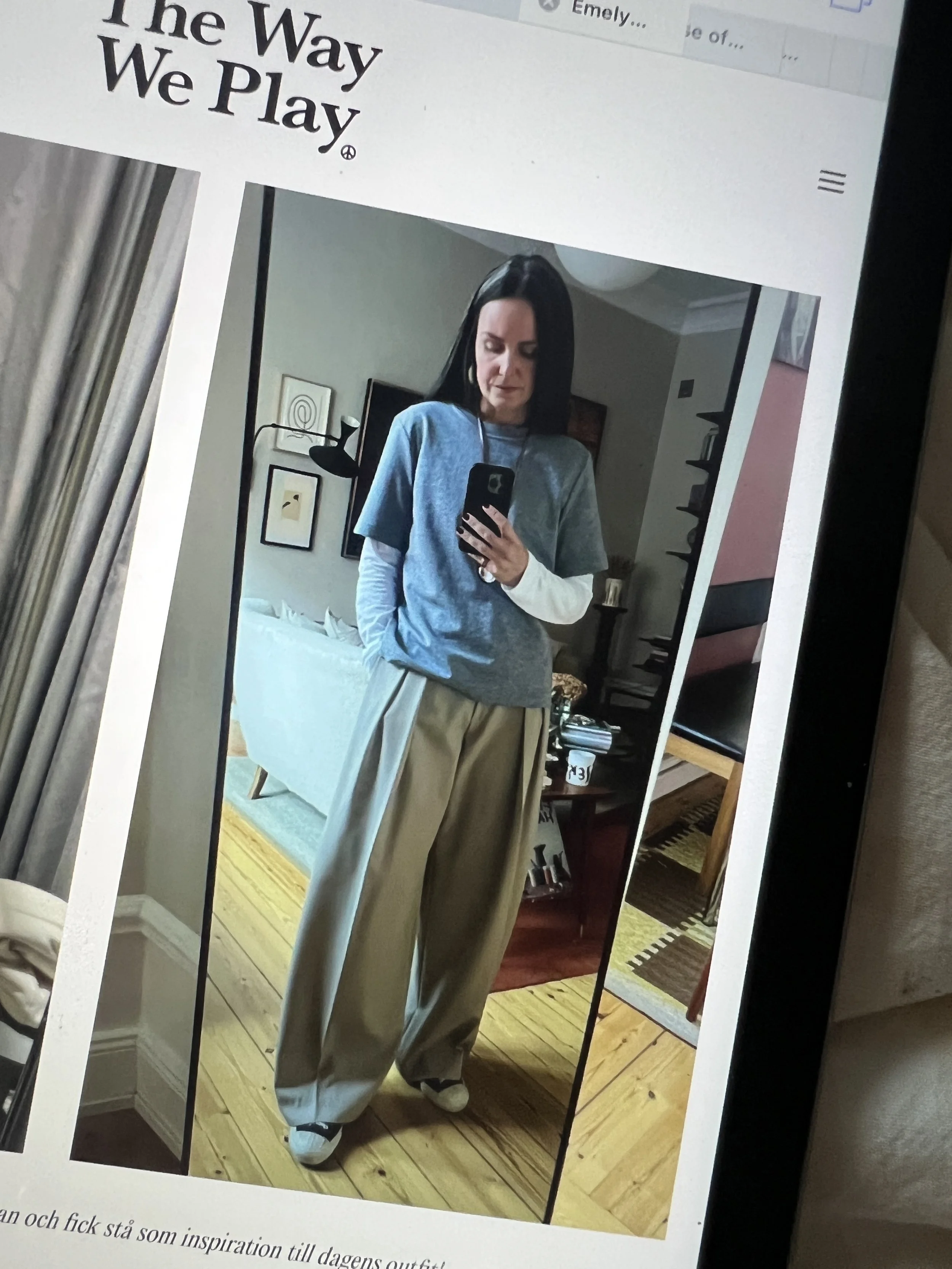 Även denna lager på lager kombinationen är snygg, vit lång t-shirt med kortärmad stor tröja över Ser att det är populärt nu med stora och vida byxor, snyggt. Men kanske mer för om mnan jobbar på kontor eller liknande.