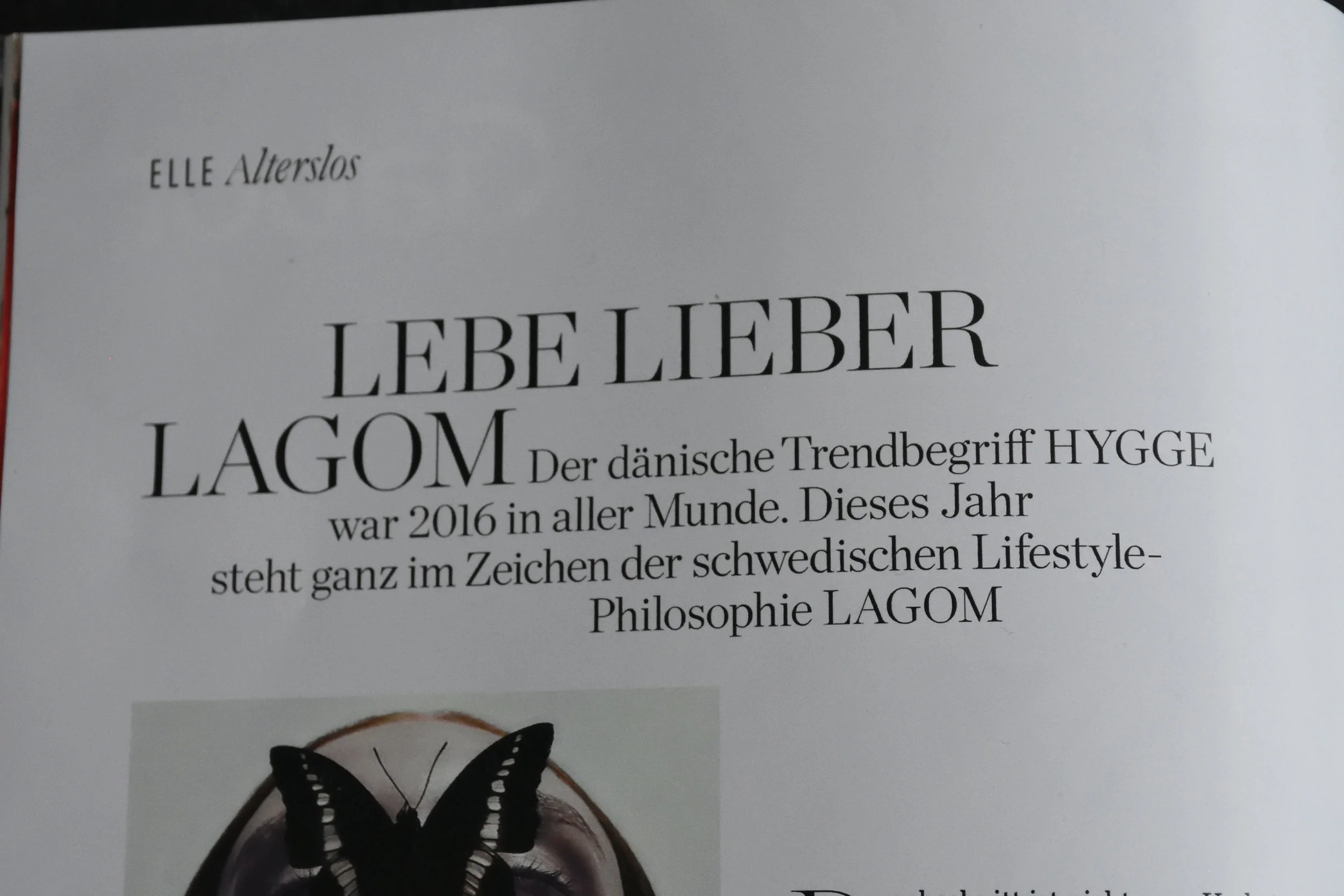 Har nu stött på vid tre olika tillfällen de senaste veckorna att vårt fantastiska ord lagom är på väg att bli populärt även utomlands. Eller kanske bara i Tyskland? Tänkte på det första gången när jag såg det i marsnummret av tyska utgåvan av Elle och att lagom nu hade ersatt danska Hygge. Sedan hörde jag det på P1 kultur imorse samt läste bloggen My Scandinavian Home där bloggerskan (kan inte hitta hennes namn) just blivit intervjuad av en tysk tv-kanal om just ordet lagom och dess använding