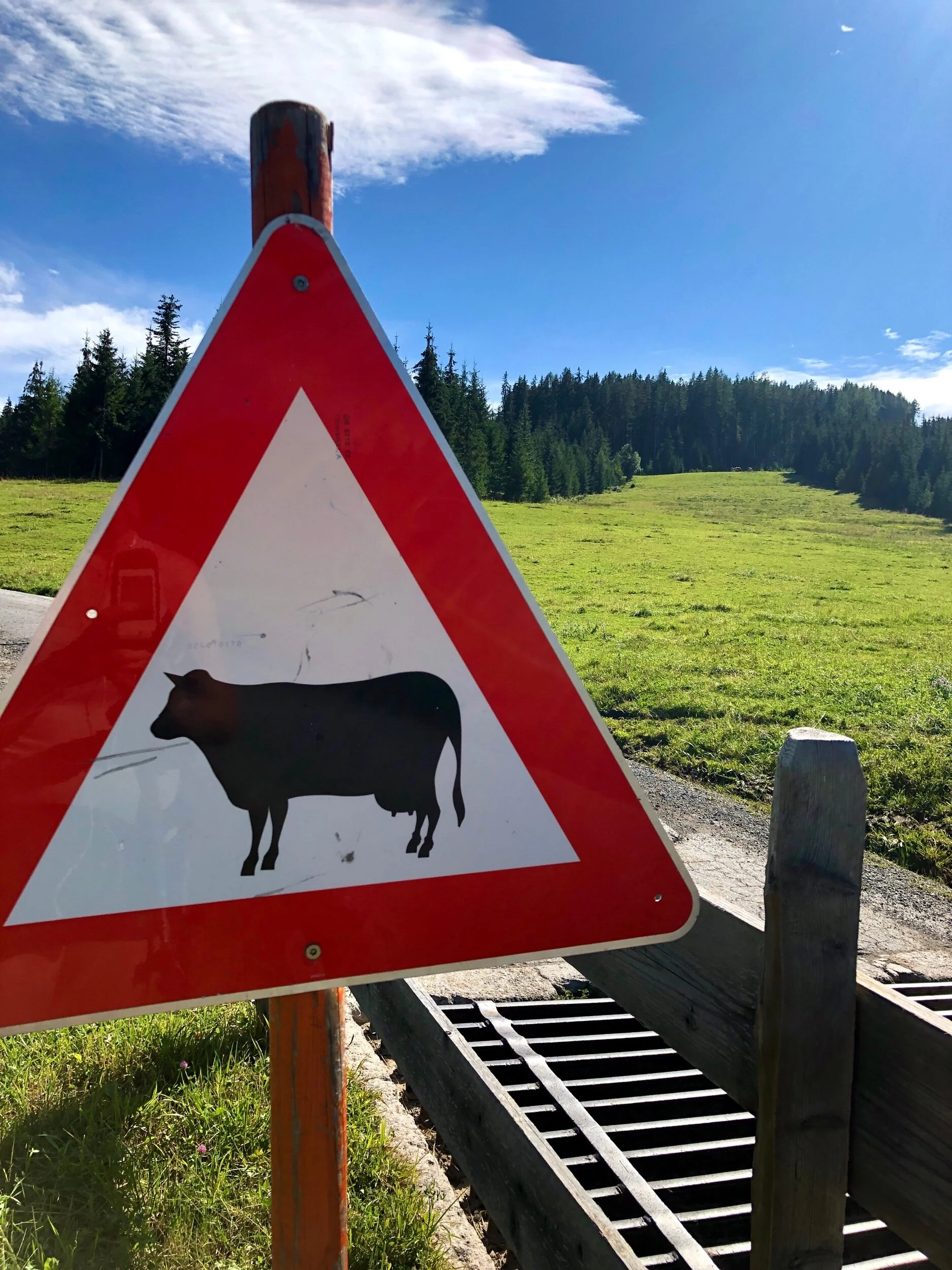 Common view in the alps with both the sign and the grid on the road ( just so they will not cross the road). The cows are up in the mountain the whole summer, soon they are slowly walking down and home to the barn for the winter.