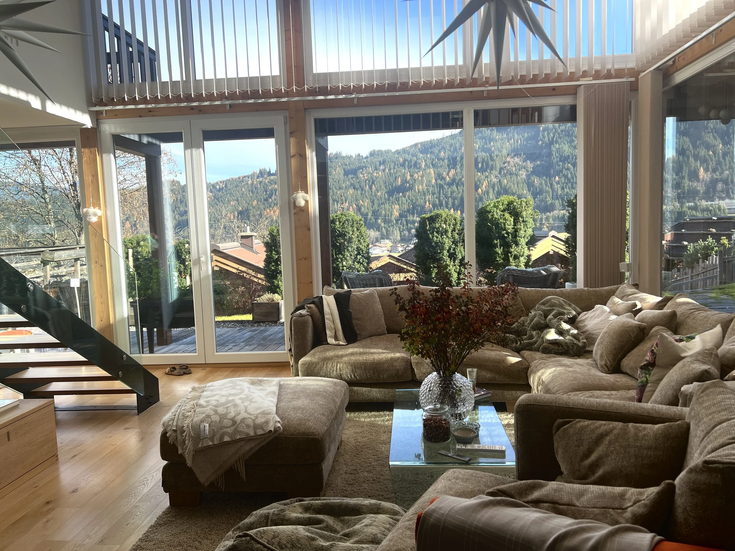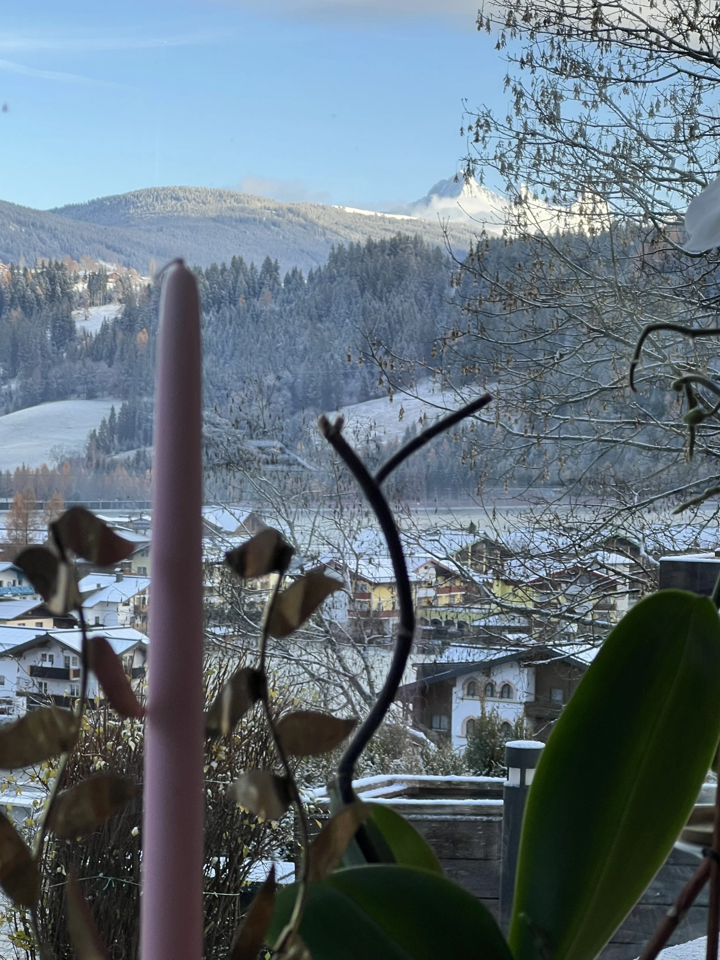 Godmorgon, så här såg det ut igår morse från vårt köksfönster när jag tog min andra kopp kaffe. Vackert eller hur? Du kan se glaciären Dachstein i bakgrunden.
