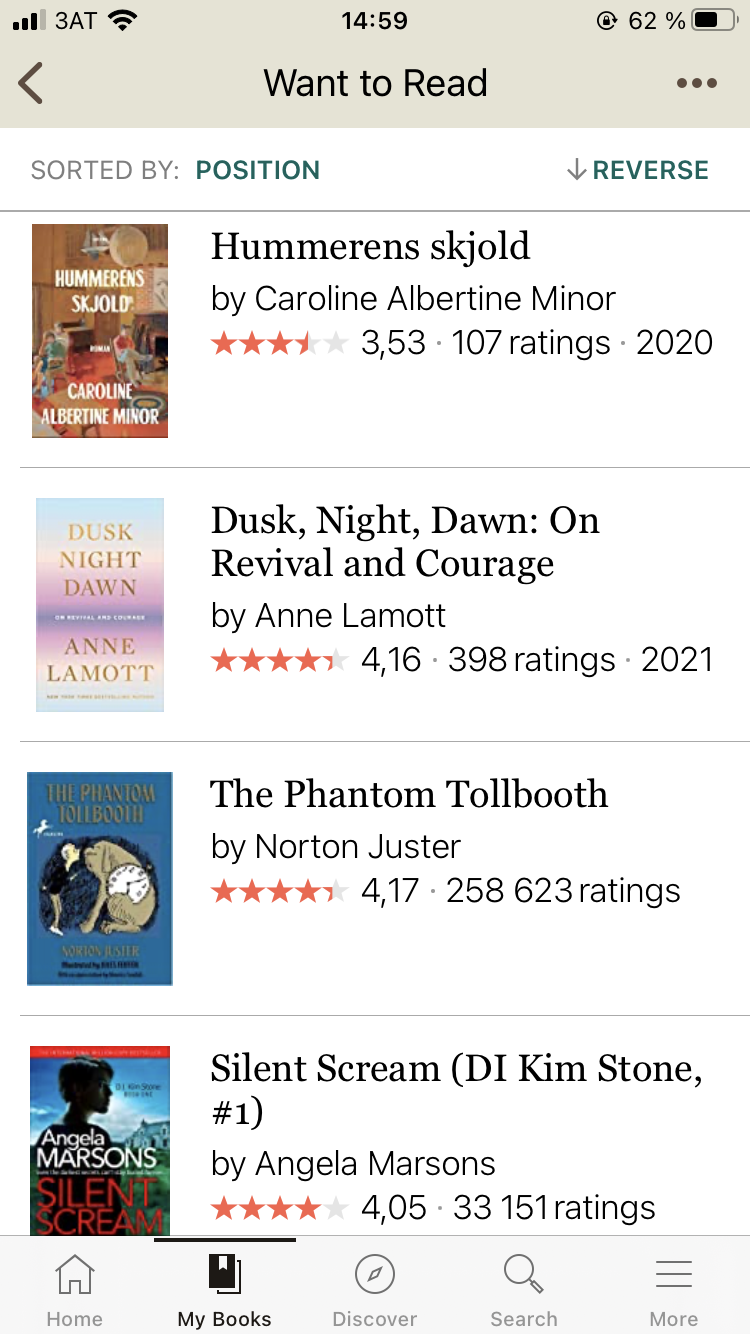 Jag har även en del, men inte alla, också på en läslista på mina ljudboksapp Nextory. Här finns främst svenska böcker. På goodreads sparar jag främst engelska böcker, direkt när de ges ut och då kan jag sedan välja om jag vill läsa dem på engelska eller vänta tills de översatts.