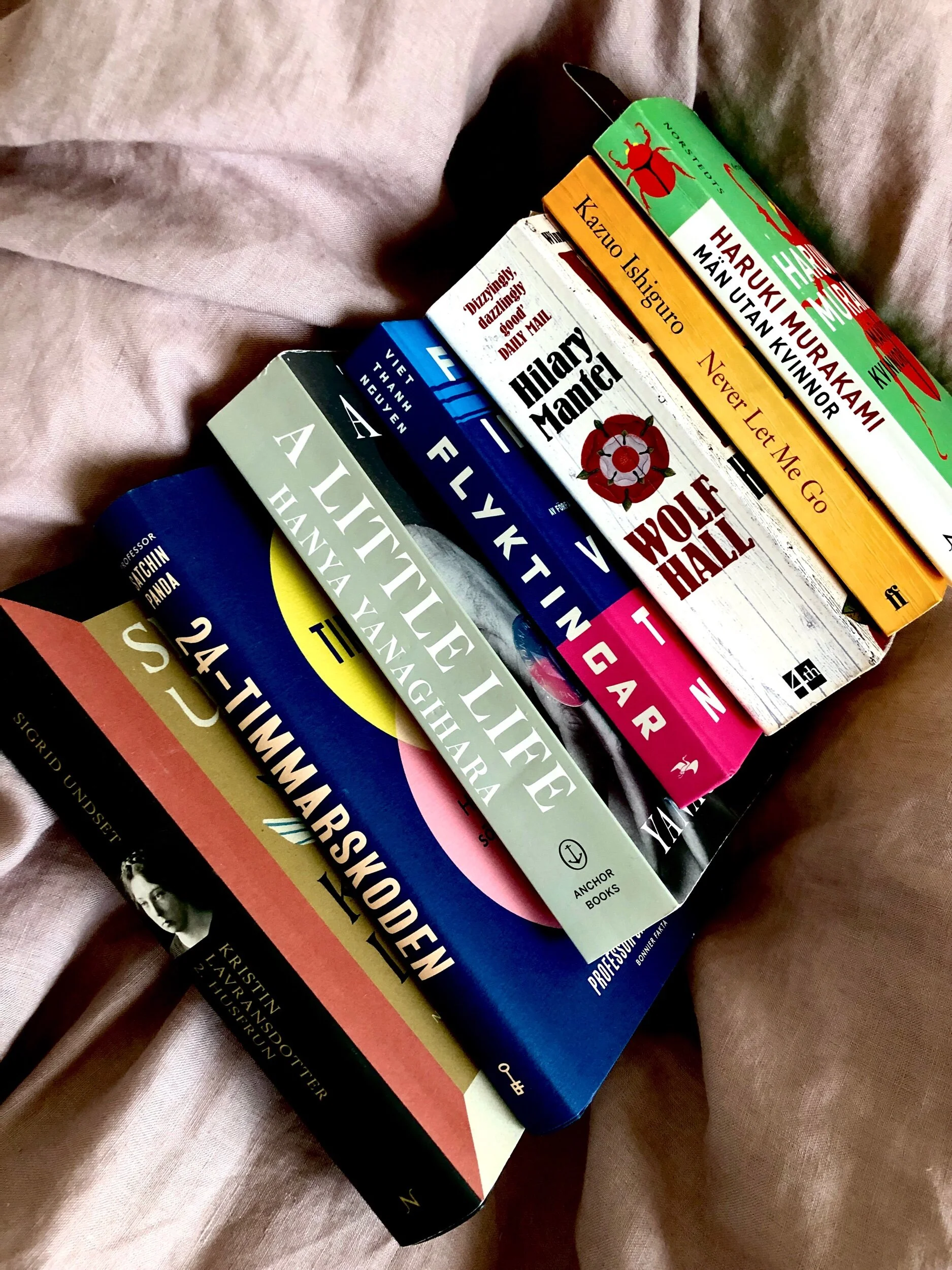 The pile of books in our bedroom. A mix of Swedish and English books. Fun fact, I have been on author talks with Jonathan Franzen many years ago. Do you see the Japanese book? It's also nice that each book has a little story, like where I bought it or borrowed it. I borrowed the top three one from my eldest daughter and my mother-in-law respectively. Incidentally, she bought all 75 volumes when her husband turned 80 a few years ago. And yes, I’m going to give them back.