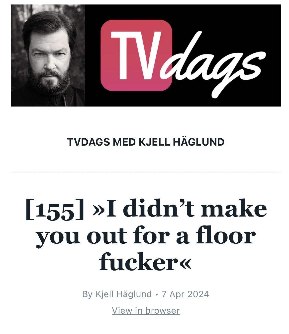 Ett tips till nu så här på söndagskvällen är att kolla in är nyhetsbrevet TV Dags med Kjell Häglund. Dessa kommer varje söndag och är en perfekt genomgång av tips på serier att kolla på just nu. Det blev för mycket serietittande under corona och därefter är det svårt att hitta bra serie som är värda att se (och spendera tid på). Och alla olika strömningstjänster, ojoj Det är svårt att hålla koll på allt. Men just Kjell är bra på att sammanfatta och skriva om det som kommer och vad som är värt att se. Hans recensioner passar min tittarsmak.