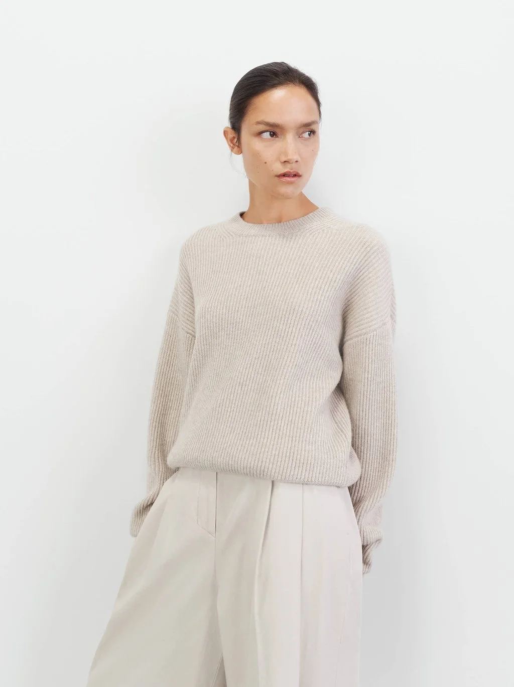 Även denna lager på lager kombinationen är snygg, vit lång t-shirt med kortärmad stor tröja över Ser att det är populärt nu med stora och vida byxor, snyggt. Men kanske mer för om mnan jobbar på kontor eller liknande.