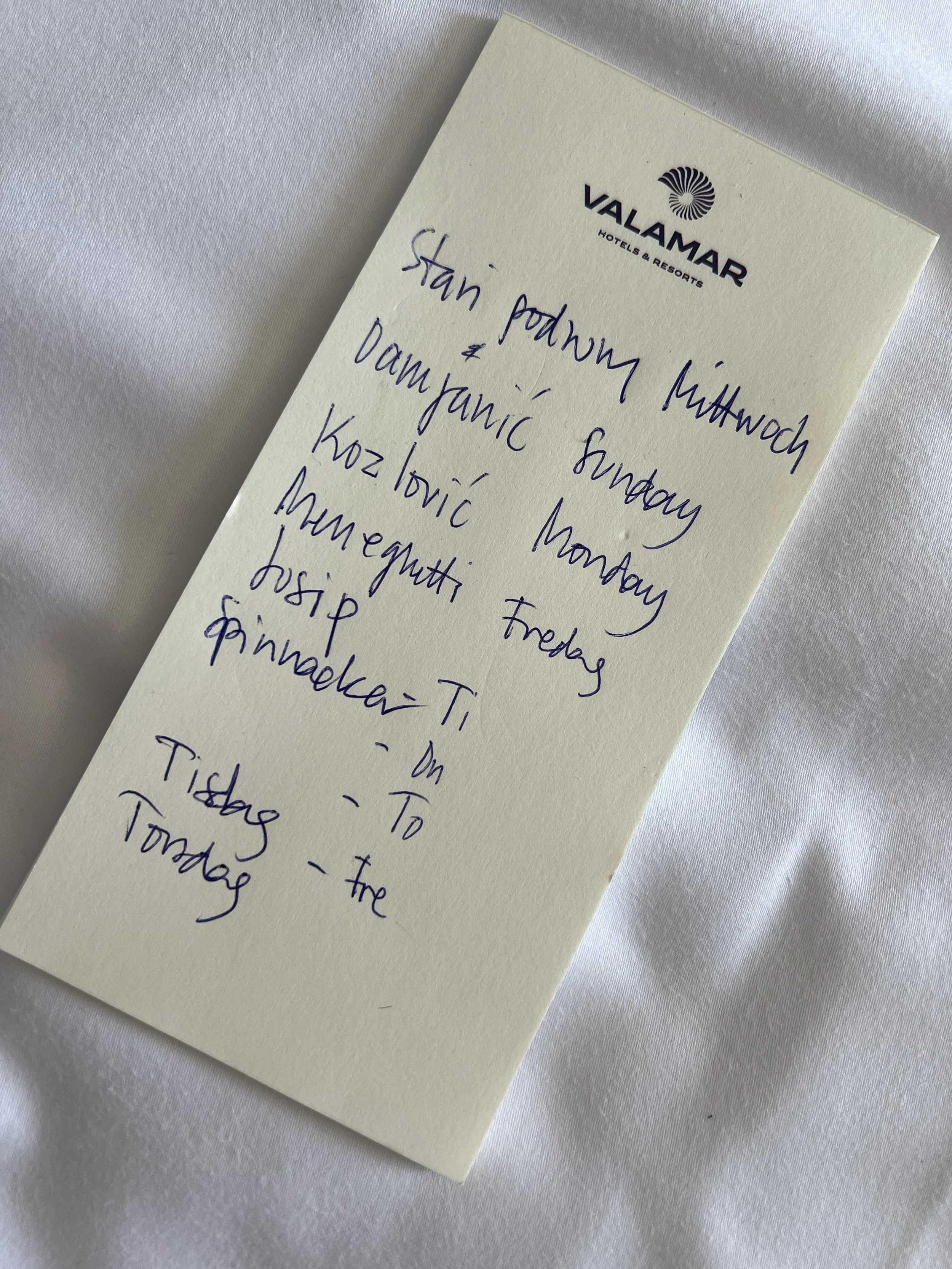 We are going to visit a few vineyards this week to buy a couple of boxes to take home, and eat at a few restaurants. But then we need to keep track of when they are closed. The tradition here around the Mediterranean is that they have a day off, and it can be different for different places, so it is important to keep track of them. There were notes in German, English and Swedish…