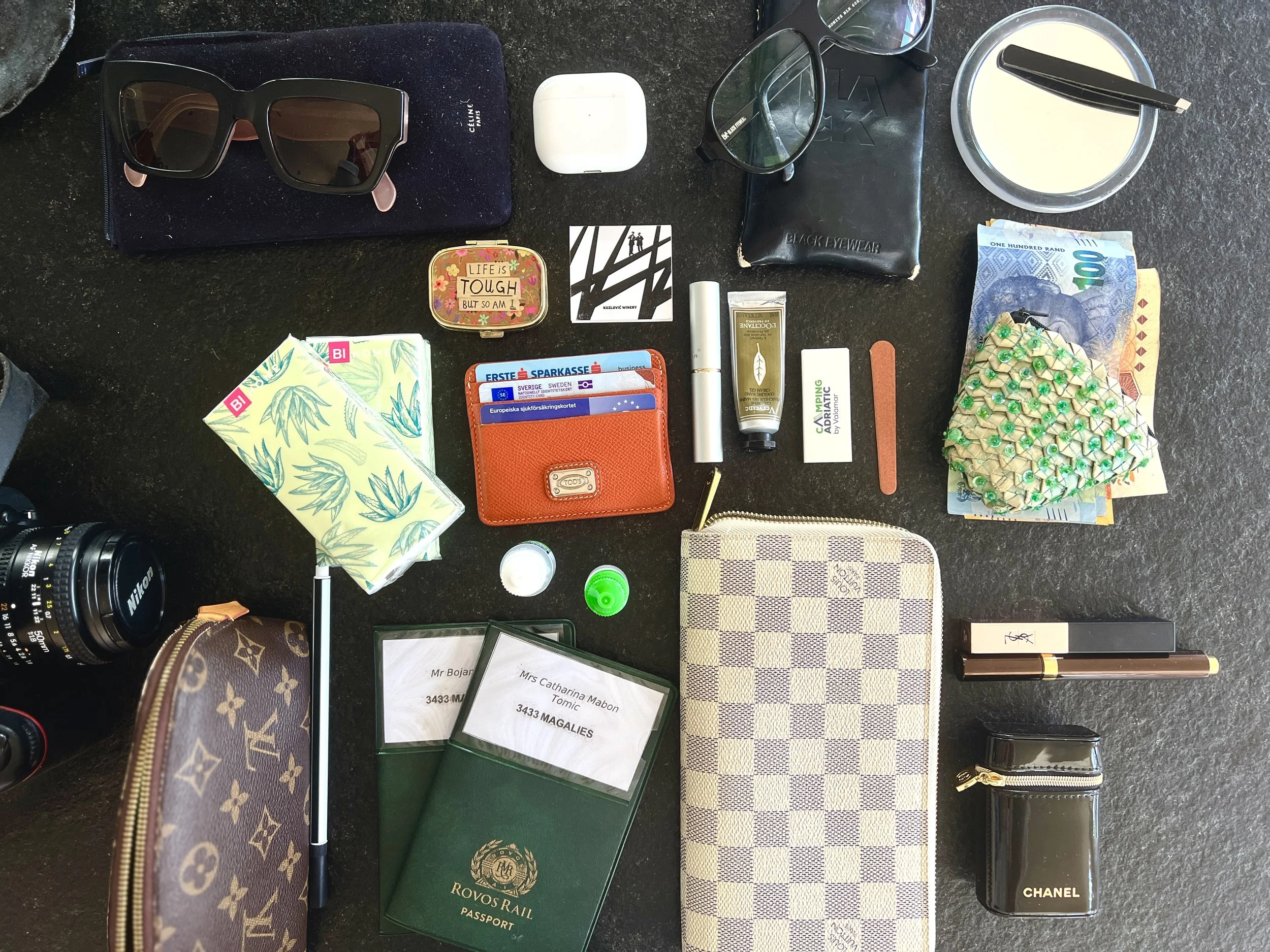 Jag har alltid haft min handväska packad med samma saker, mer eller mindre. År ut och år in. Det kommer från åren då jag var på resande fot med jobbet hela tiden och då insåg jag att jag sparar massa tid att inte packa och packa upp hela tiden, och att tx ha en plats för det som jag behöver inför varje resa. Som nu när vi är ute på flera resor så har jag ett rum där jag lägger upp saker från förra resan och vad av detta som jag behöver på nästa. Så smidigit.. För många år sedan fick jag också ett tips från min faster att alltid t.ex. en rese-necessär klar och färdig för resa. Oj, vad det underlättade. Två uppsättningar av allt, en uppsättning hemma och en uppsättning i necessären, vilket fungerade toppen under de åren, och inget blir gammalt då man använder smink mm varje dag. Nu har jag inte det, men har absolut ett system med vad jag alltid måste ha med mig.
