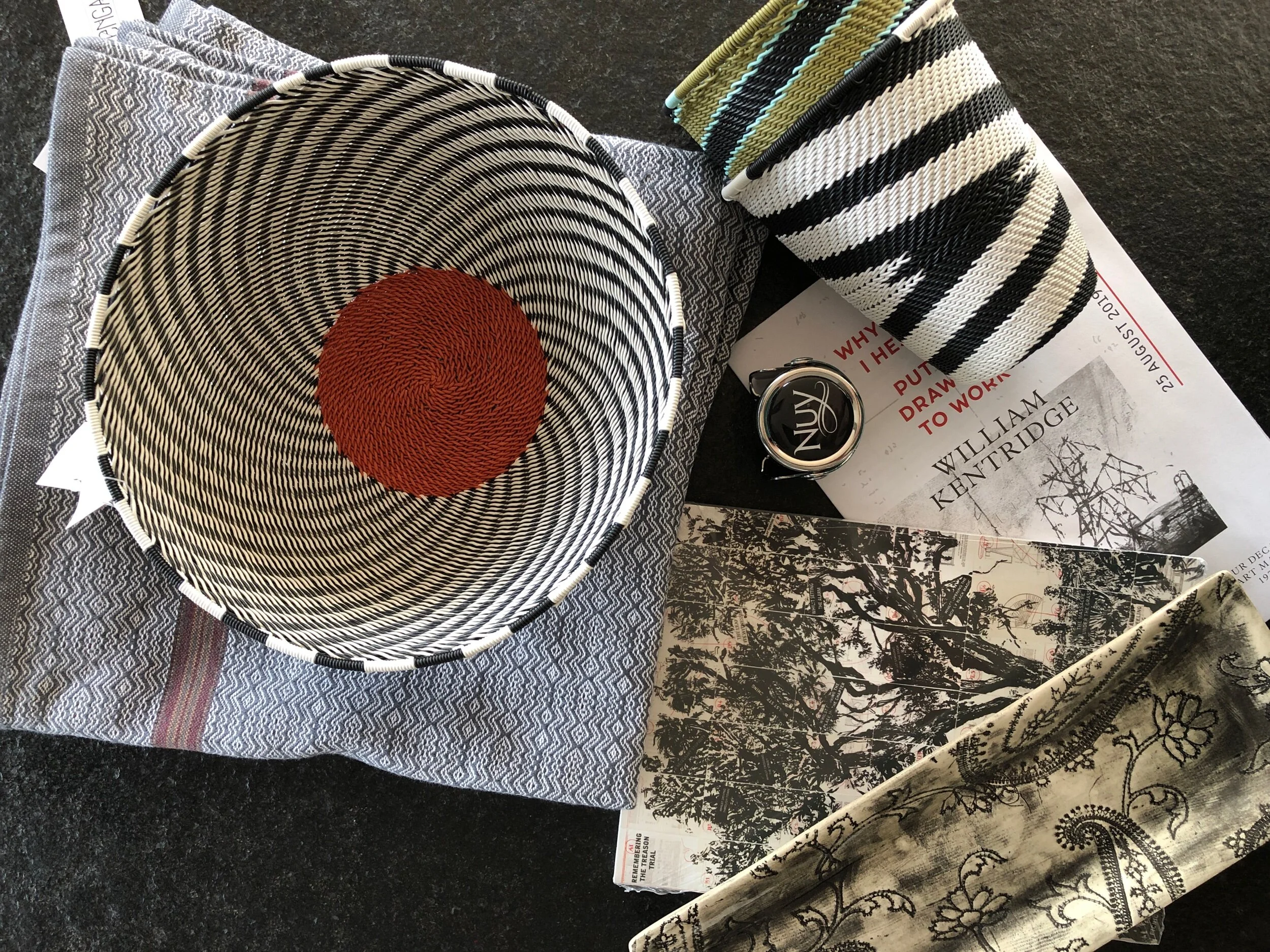Sedan blev det två kökshanddukar, lite fina saker i telefontråd, champagnekork från vingården NUY, en anteckningsbok och ett litet fat för skedar och spadar som står vid sidan av spisen när vi lagar mat. Ett program från utställningen på Zeits MOCAA av William Kentridge, som var helt fantastisk.