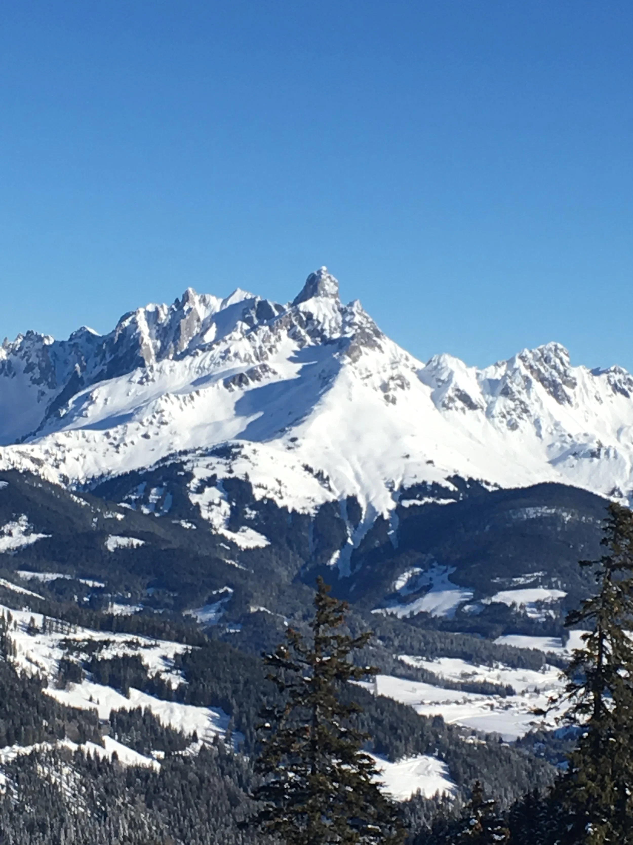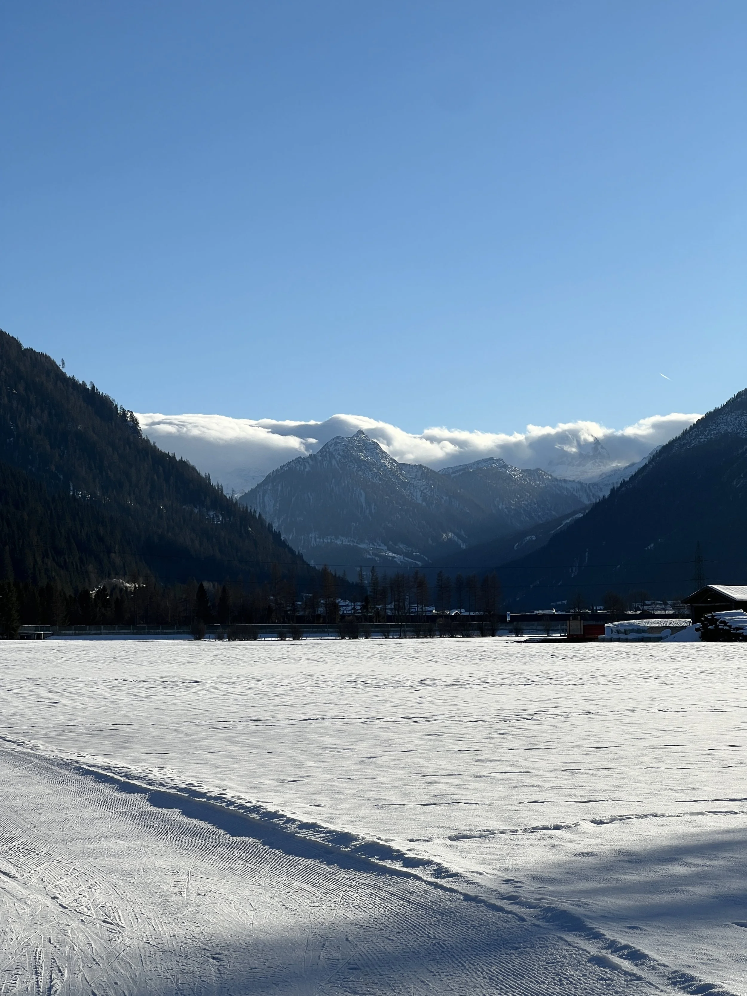 Långpromenader i solen. Vilket här betyder att man vanligtvis går i dalgångarna. Vi har ett mikroklimat här, och här ser ni Tauern i bakgrunden, som är ett stort bergsmassiv i söder. I vanliga fall betyder mikroklimatet att vi får massa snö. Men just denna vinter har Tauern hindrat oss från snö som kommer söderifrån. Och i norr är det Hochkönig, som är bergsmassivet i norr. Och som i år också har hindrat snön att komma till oss. Överallt snöar det en halv meter varje vecka men inte hos oss. Inte denna vintern.