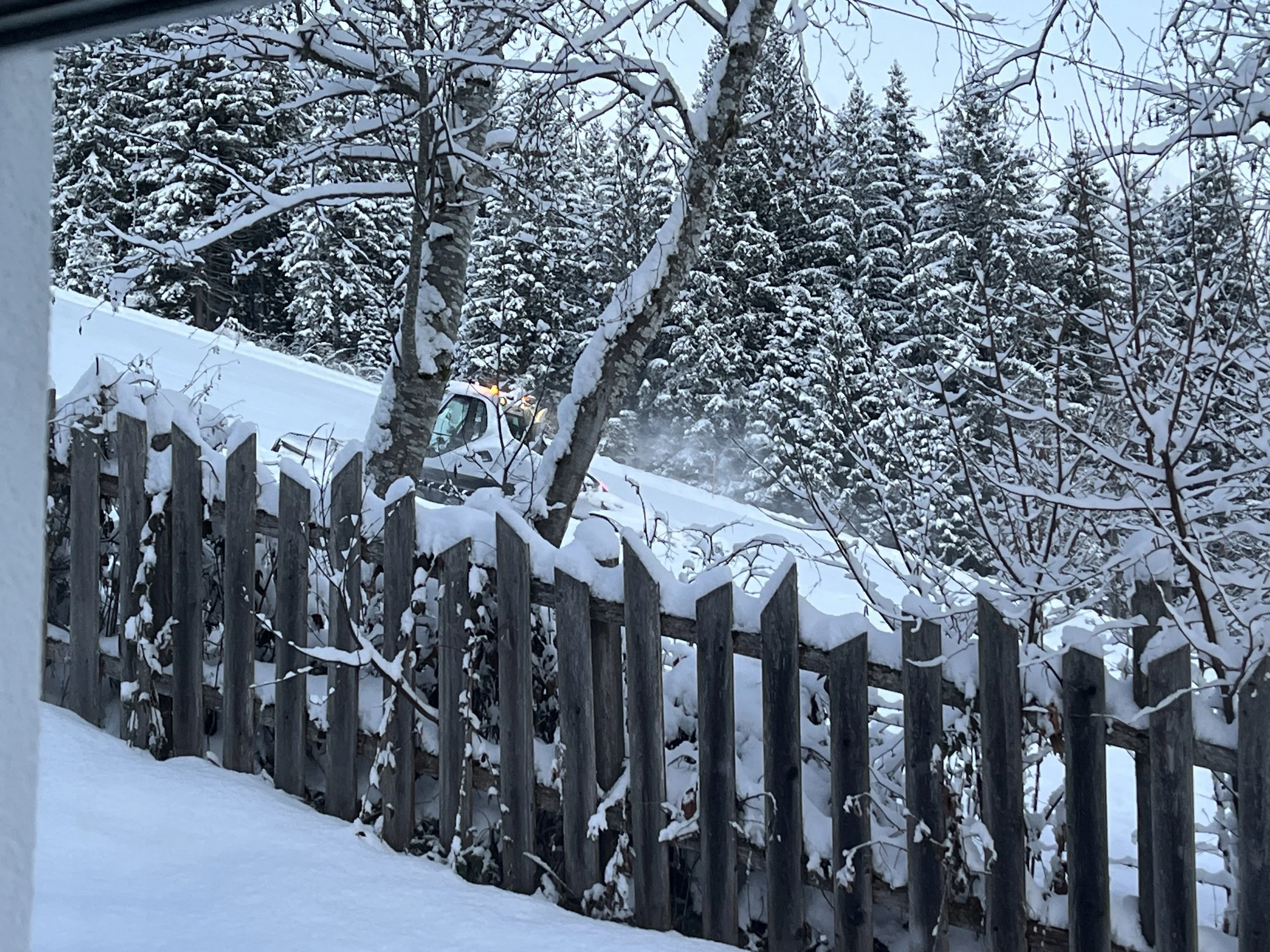 07.00 Väntar här på att vattnet skall koka upp till mitt varma citronvatten men en knivsudd Himalayasalt i och jag passar då på att titta ut genom vårt köksfönster för dagens vy. Idag var pistmaskinen ute en andra gång för att pista efter nattens snöfall.