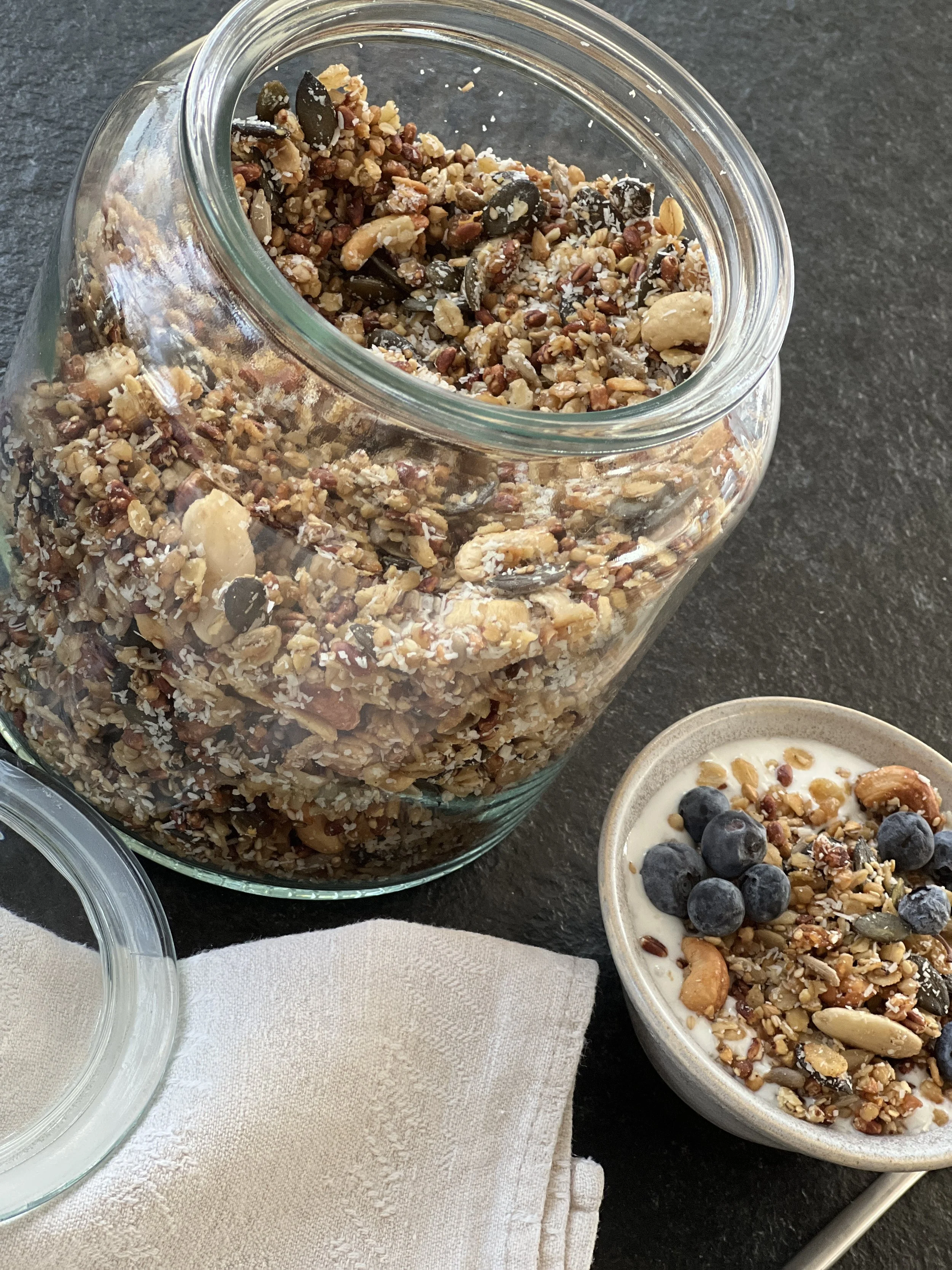 I got a craving for granola after eating the granola sent to me by my friend/aunt from Bree’osh i Montecito,, so I made Danish Fredrik Bille Brahe’s granola recipe from Johanna Bradford’s blog. So delicious!
