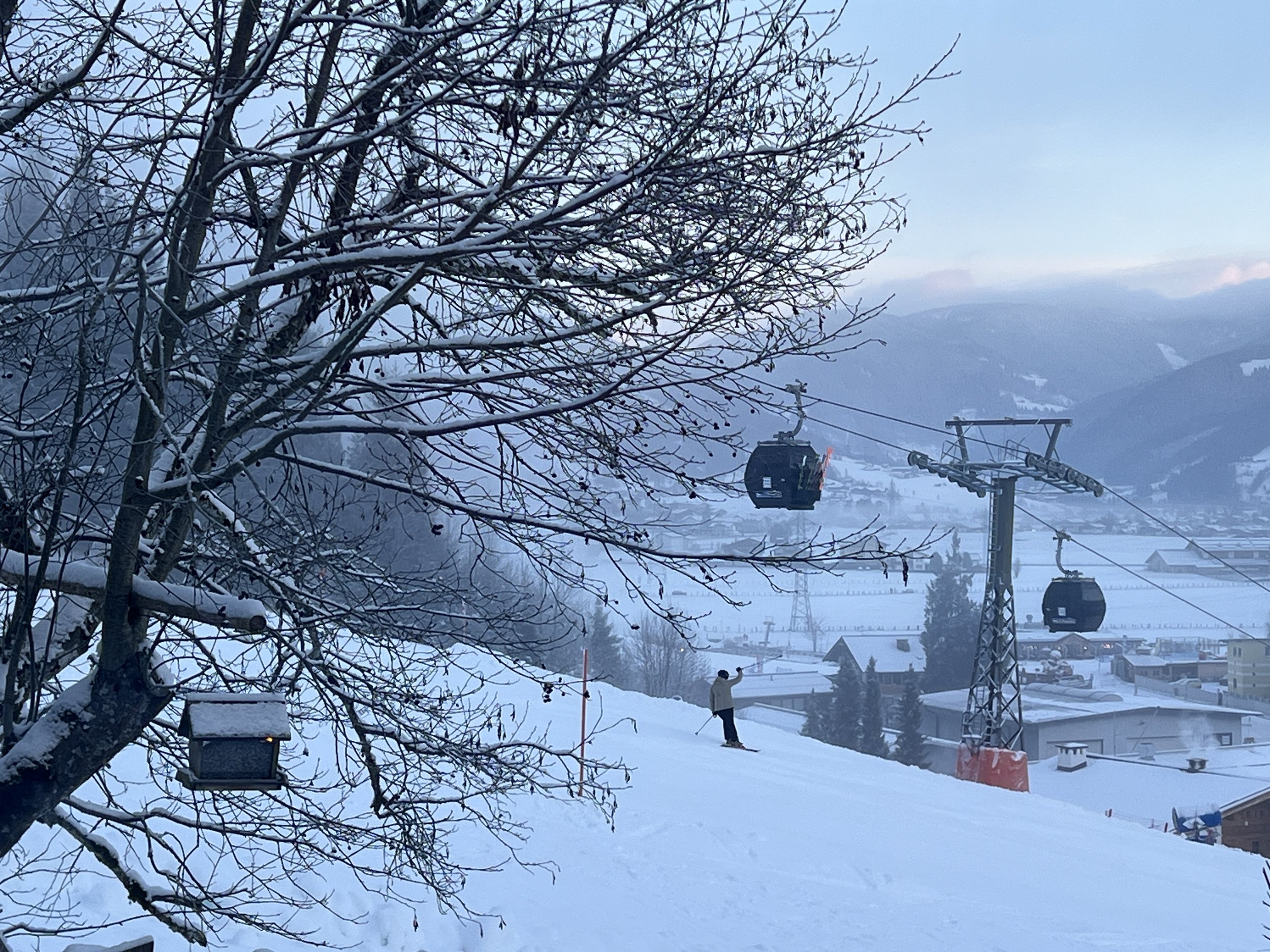 Above you see the sun rising behind the mountains, and the one waving is my oldest daughter who was out on the ski slope with my husband last Christmas, at eight in the morning. Here I am standing at our dining area, with a view of the ski slope, and waving to her.