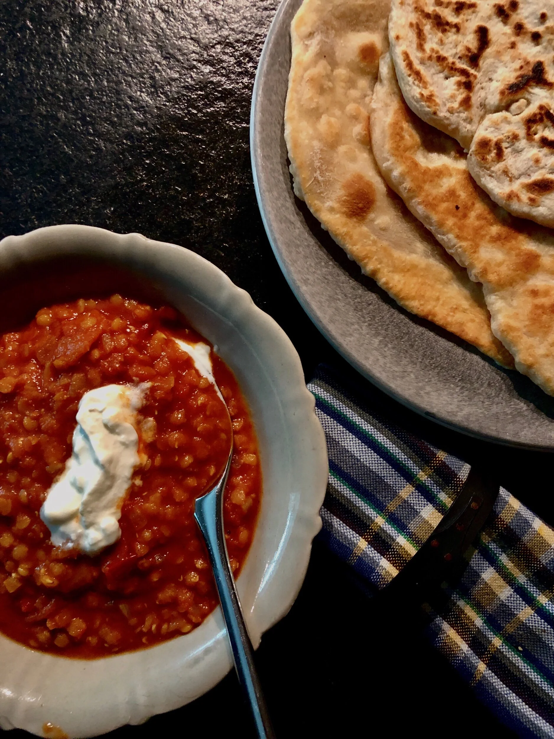 Daal med färska tomater och med naanbröd. | Daal with tomatoes and naan.