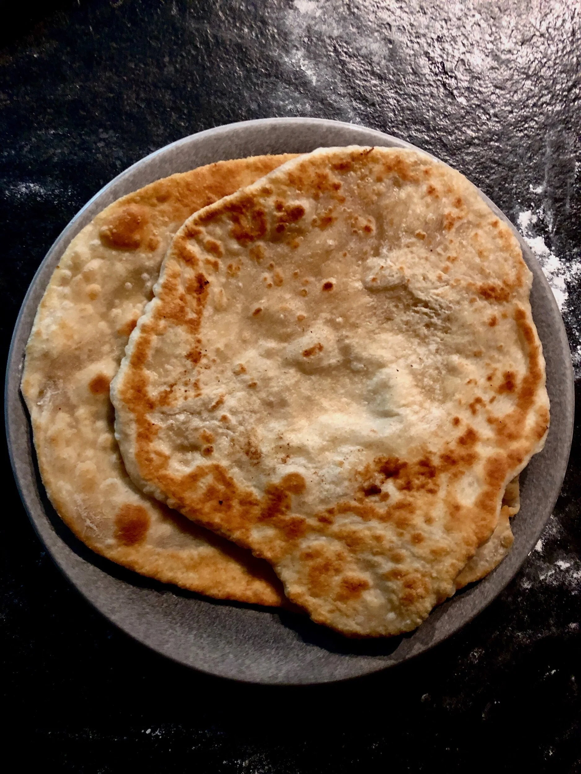 Knead the dough for a couple of minutes and roll out into 6 flatbreads. (Or choose how many you want to eat and freeze the rest of the dough and bring out the next time you eat Indian food).