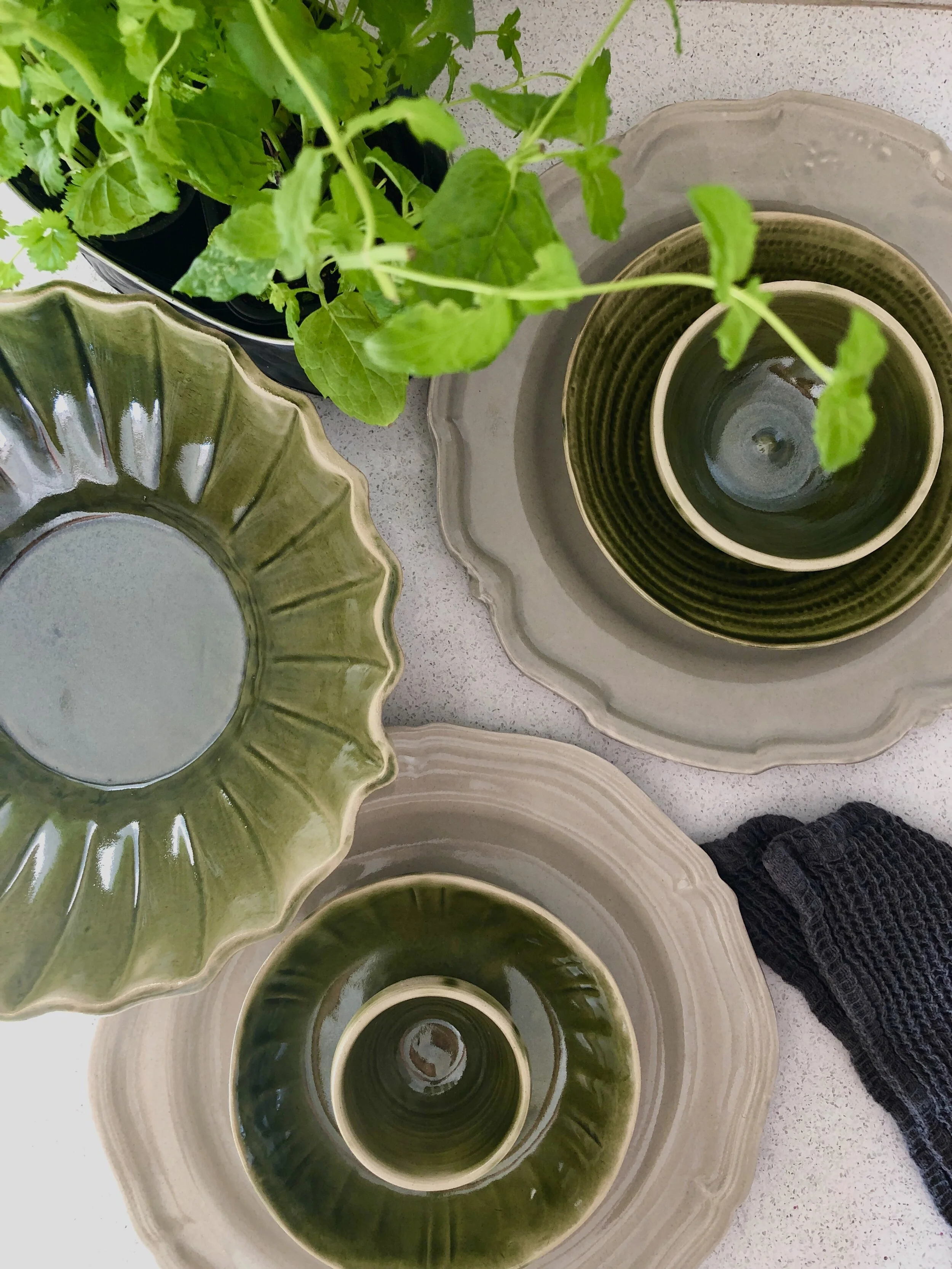 Above you see them pre-glazed. I chose pink and pine green as complementary colors to our already gray porcelain that we have here at home. The cups are slightly different sizes, and slightly different shapes, hehe. But with practice, they will be the same size. I hope 😂 My husband loves to drink his morning cappuccino in one of the pink one.